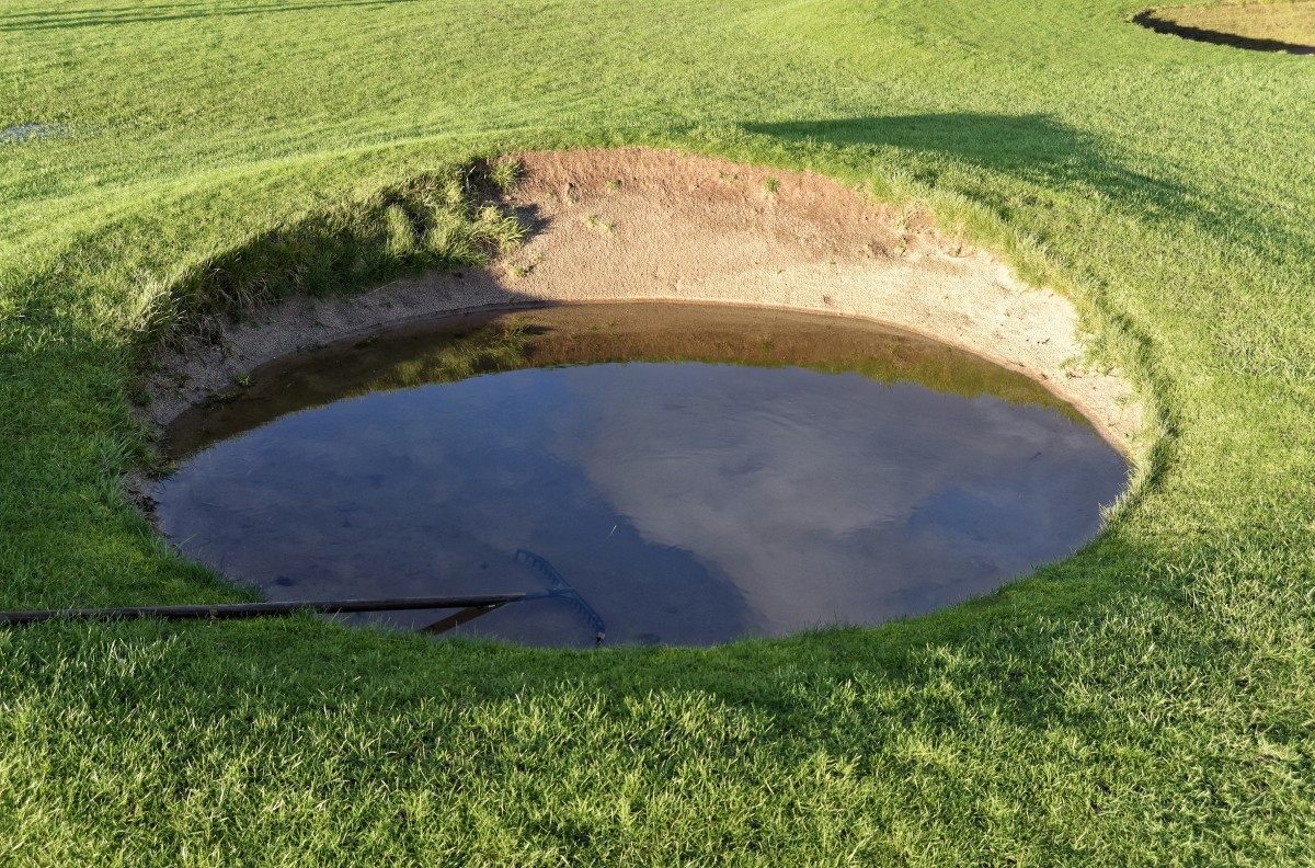 사진처럼 벙커가 모두 물에 잠긴 경우에는 수리나 처리가 필요한 구역으로 정할 수 있습니다. 이런 경우 당연히 무벌타로 백온더라인 구제를 받게 됩니다. 하지만 보통 일반 아마추어 플레이 중에는 그런 구역을 미리 정하기도 어렵고, 물로 가득 찬 벙커는 만나가기 어렵습니다. 이런 경우에는 기본적으로 위에서 언급한 비정상적인 코스 조건으로 보고 구제를 받게 됩니다.