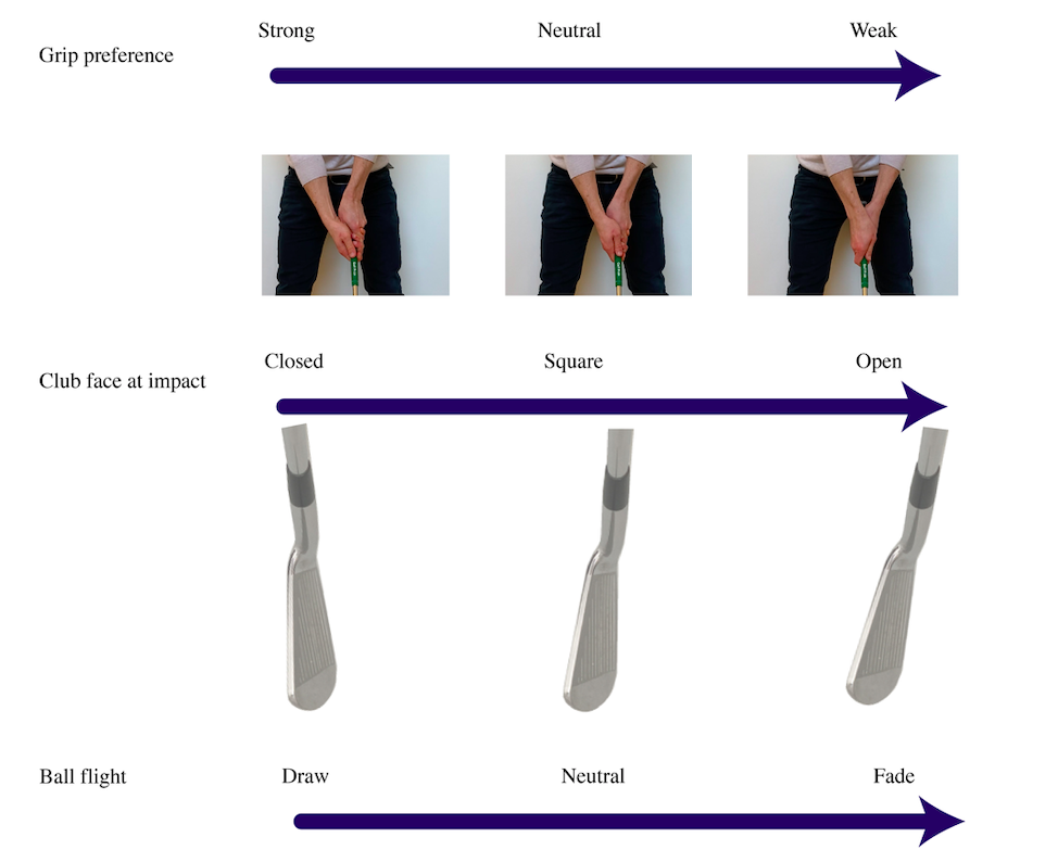 위 이미지는 골프그립에 따른 아이언 헤드 페이스의 열림-닫힘의 정도과 그에 따른 볼의 구질 변화를 쉽게 보여줍니다. 그리고 각 구질에 유리한 그립도 확인할 수 있습니다.