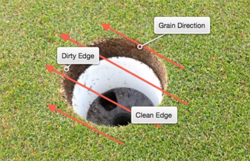 아래의 홀컵 사진은 가장 쉽게 잔디의 결을 확인할 수 있는 모습입니다. 컵 주변의 에지가 지저분하게 잔디의 뿌리가 보이고 깔끔하지 않다면 잔디가 홀컵 반대방향으로 누워있는 상태입니다. 그렇다면 사진에서 처럼 누워있는 쪽으로 볼이 가는 경우 볼이 더 빨라지겠지요? 그리고 옆 라이로 생각하면 라인을 더 보면 좋습니다.