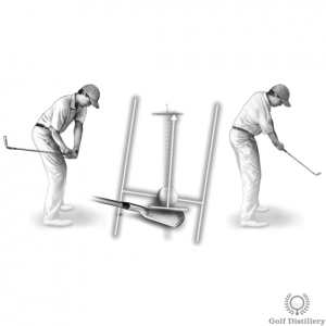 페이드 샷의 클럽 페이스의 임팩트 지점을 살펴보면 페이스의 중심보다 다소 힐 쪽에 형성되고 있음을 확인할 수 있습니다. 임팩트 시 약간은 닫힌 클럽 페이스와 아웃투인의 클럽패스, 그에 따른 기어 효과로 인하여 우측 높은백스핀으로 인해 페이드 구질이 형성됩니다. 아래는 스윙궤도까지 같이 살펴볼 수 있는 심플한 그림입니다. 클럽헤드가 높은 상태에서 안쪽으로 많이 눌리며 아웃투인의 패스가 형성됩니다.