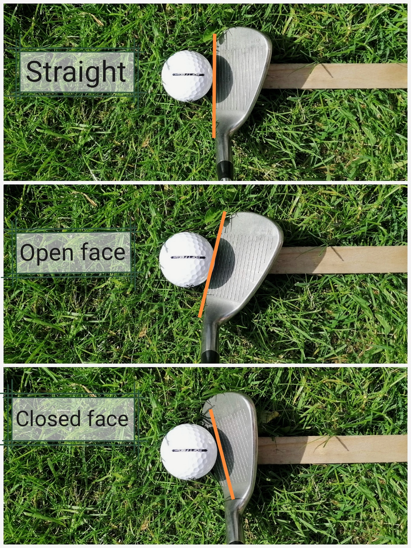 아래의 사진은 세가지 샷의 임팩트 직전의 모습으로 보면 참고하기에 좋습니다. 클럽의 페이스의 열리고 닫힌 정도를 확인할 수 있습니다. 스퀘어를 이루는 첫번째는 스트레이트 구질을 내기에 적절하며, 열린 페이스는 페이드, 닫힌 페이스는 드로우 구질에 적절합니다.