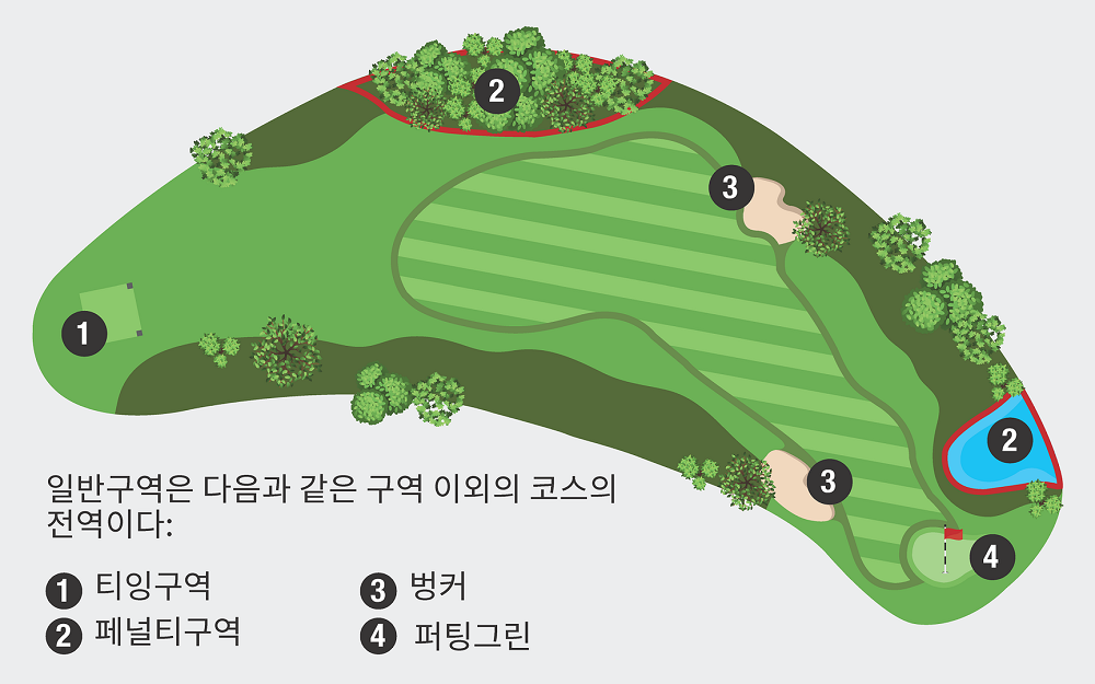 1. 티잉 구역 2. 페널티 구역 3. 벙커 4. 퍼팅 그린