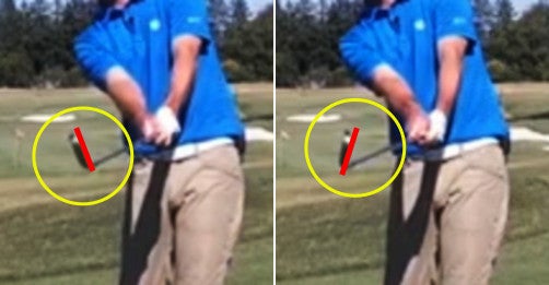 실제로는 클럽이 몸(가슴)을 추월하는 타이밍이 ROC에 미치는 영향은 커진다는 것을 위 영상에서는 말하고 있습니다. ROC를 느리게(낮게) 하려면, 아래 사진과 같이 가능한 한 클럽 헤드가 가슴 센터를 추월하는 것을 늦추도록 해야 합니다.